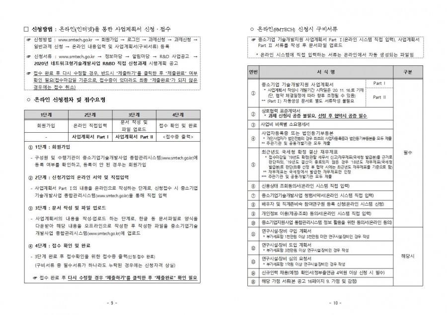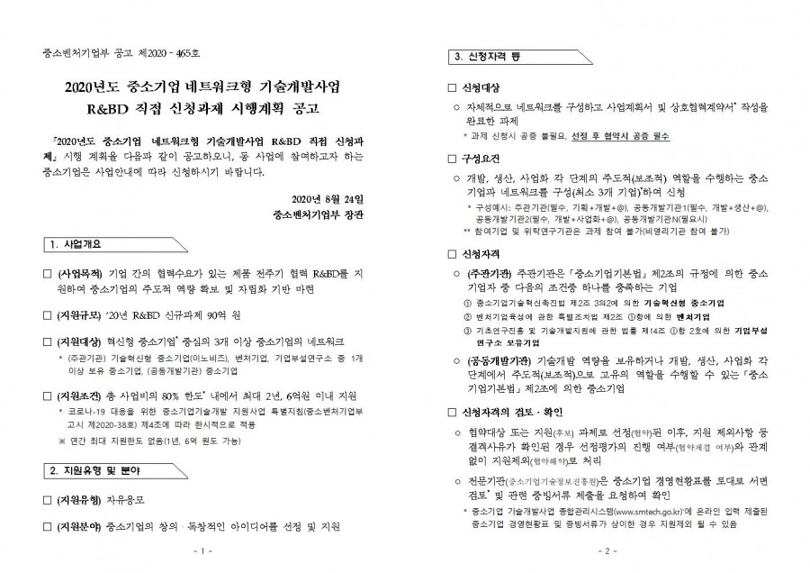 2020년도 중소기업네트워크형 기술개발사업 R&BD 직접 신청과제 시행계획 공고