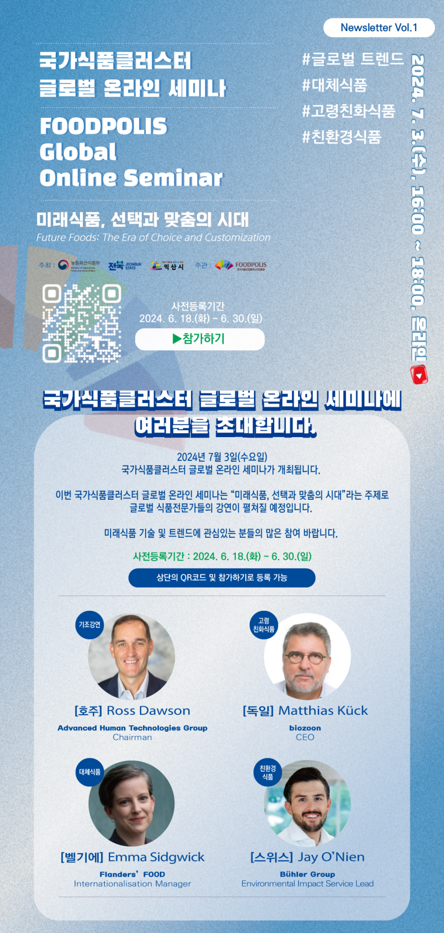 미래식품, 선택과 맞춤의 시대’를 주제로「국가식품클러스터 글로벌 온라인세미나」를 개최하오니, 미래 식품산업에 대한 국내외 기술 및 트렌드에 관심 있으신 분들의 많은 참여 바랍니다.